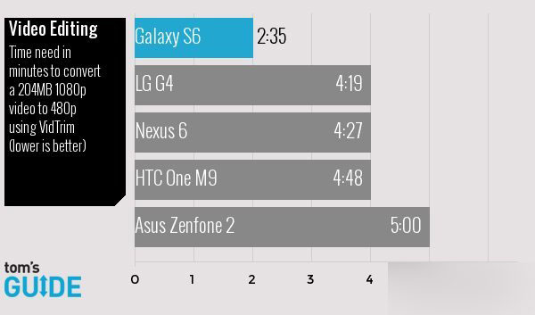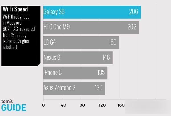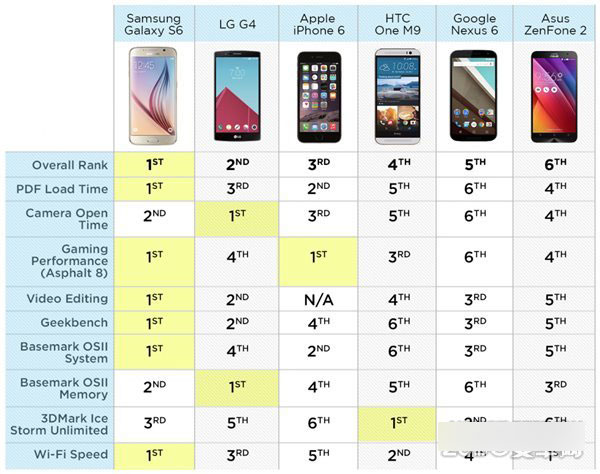 此外,Tom's Guide還進行了視頻編輯速度、GeekBench、3DMark Ice Storm、WiFi速度等共9項對比測試,三星Galaxy S6以6個項目第一的成績在整體評分中勝出,第二、三名依次是LG G4和iPhone 6.