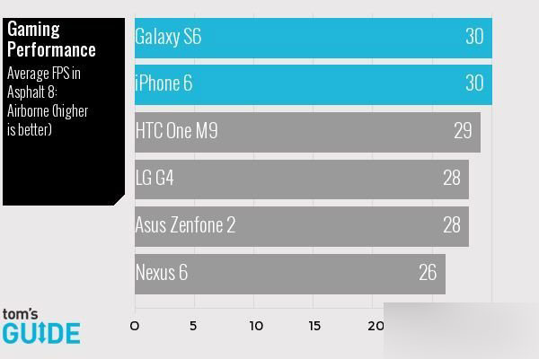 而在游戲能測試中,以《狂野飙車8》為例,Galaxy S6和iPhone 6均以30FPS的平均幀數並列第一,此時骁龍810的HTC One M9得益於GPU的優勢終於稍微優於骁龍808的LG G4了。在視頻中的慢鏡頭回放可以看到,Nexus 6的拖幀現象十分明顯,所以成績相對還是最差。