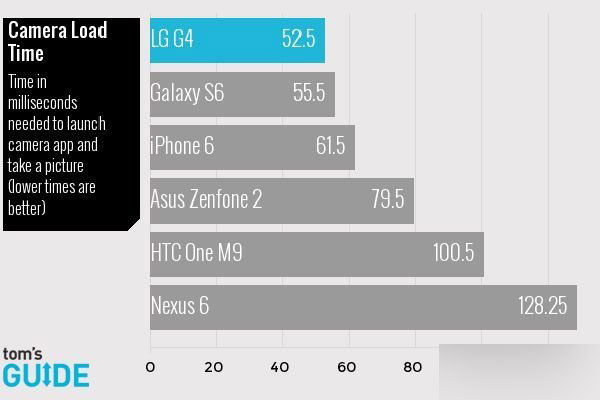 在啟動自帶相機速度對比中,LG G4以52.5毫秒領先,視頻中Galaxy S6和iPhone 6的表現相當,幾乎是同時完成了開啟過程,相對最慢的依然也是Nexus 6。