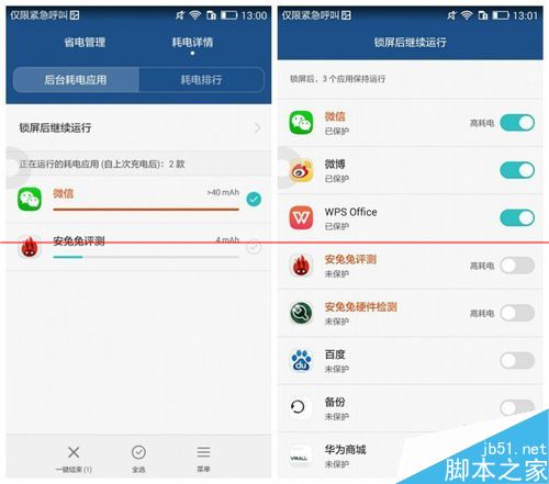 2、點擊【耗電詳情】可以看見手機的耗電情況,點擊【鎖屏後繼續運行】,然後可以根據自身的情況,關閉一些不需要的程序