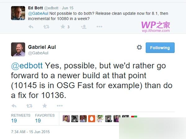 當然Windows10手機版10080如果不想回滾到Windows Phone 8.1,還是有辦法的。那就是等待下一個Win10 Mobile預覽版。Gabriel Aul已經預告Win10 Mobile預覽版10145正在內部測試,預計將很快推送。並且Build 10080和10136系統都可以升級到10145。微軟更傾向推送新版本,而不是修復10136系統。
