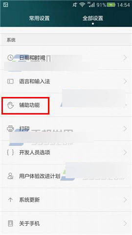 打開華為Mate7的【設置】,在【全部設置】中點擊【輔助功能】,打開【按電源鍵結束通話】就可以了。