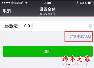 輸入金額之後,我們還可以點擊金額右下角的添加收錢說明,對該收錢欄目進行備注,以防時間一久,好友忘記是什麼活動的費用支付