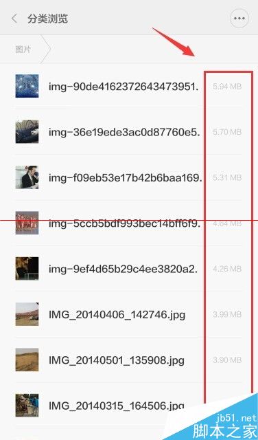 4、接下來我們可以進入到圖片、音樂、視頻這裡面,先按照文件大小排序嗎,然後有選擇性的刪除一些自己用不到的圖片視頻音樂。像我這幾張圖片都有4——6M大小,是很費內存的。