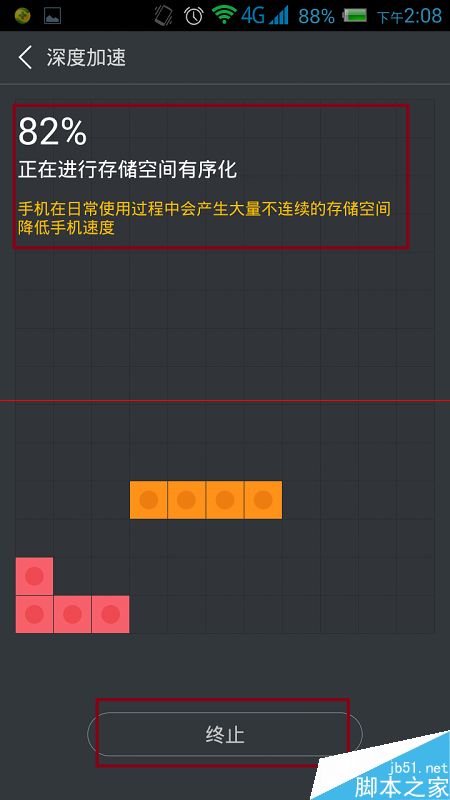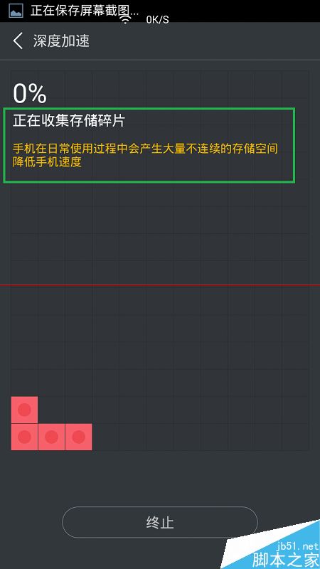 5、現在,進入到下一個階段,開始了存儲碎片的收集。需要一段的時間才能完成,可以點擊“終止”結束收集,不進行碎片的整理。