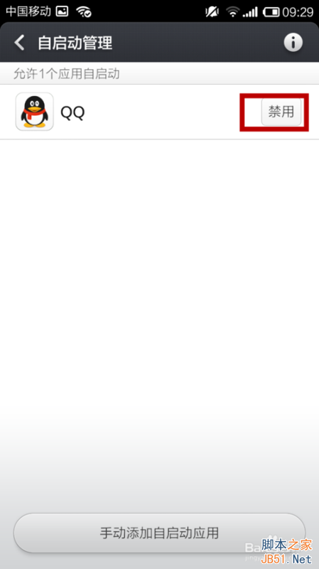 方式:打開安全中心-授權管理-自啟動應用管理-禁用QQ,如果想恢復,點擊手動添加自啟動應用-允許QQ。