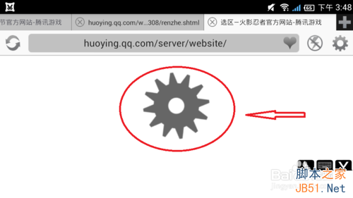 5、接著,你會看到屏幕上出現了一個滾動的 “大齒輪”圖案,看到這兒,就說明,你的設置差不多了,已經可以進入或者浏覽flash 了,然後輸入 你要玩的網頁游戲的 網站。 在這裡,我演示的是 火影忍者OL的游戲(如 huoying.qq.com)