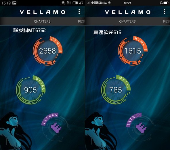 聯發科MT6752(左)和高通骁龍615(右)智能手機魯大師跑分對比