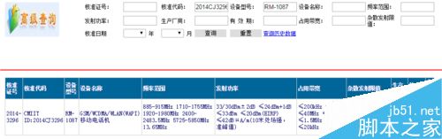 4、在頁面頂部,把CMIT ID 碼(也就是2014CJ3296)輸入到”核准代碼“欄裡,或者在設備代碼輸入”RM-1087“,點擊”查詢“按扭。