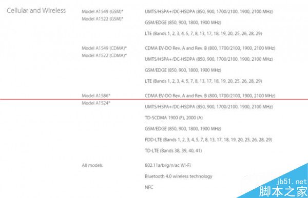 然後在看各個型號對於網絡的支持(圖片引自蘋果美國官網)