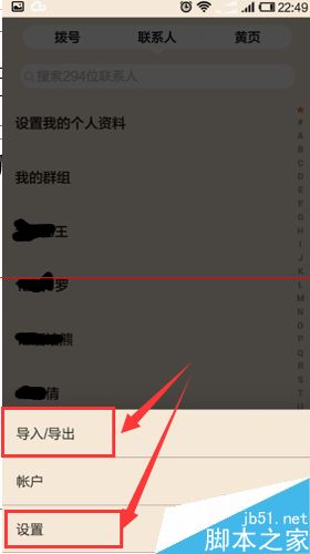 2、點擊菜單鍵(除了像小房子的home鍵和返回鍵的另一個鍵),出現“導入/導出”、“帳戶”、“”設置“三個選項