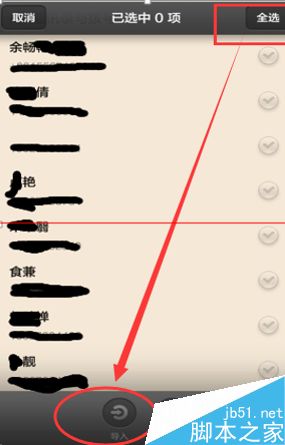 6、進入,會看到聯系人,選中“全選”會出現“導入”和“刪除”,點擊“導入”即可完成聯系人恢復。