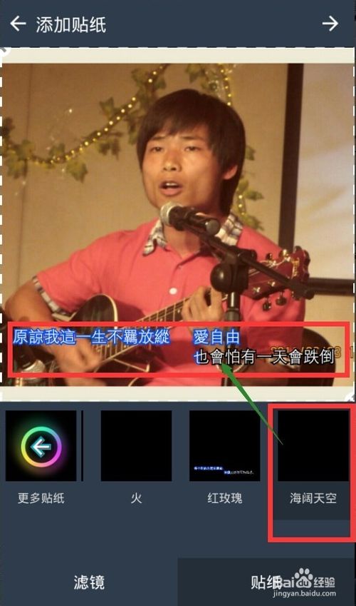 6、選擇自己喜歡的MV歌詞貼紙,然後點擊右導向箭頭下一步(頂部面板”→“),直到發布。