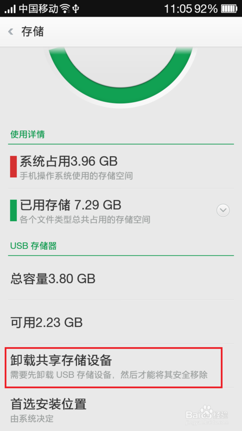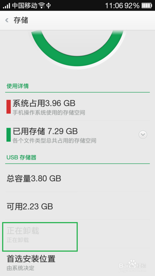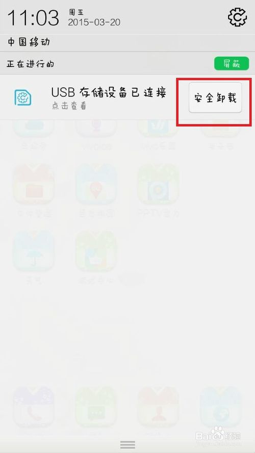 2、在電腦上要安全移除U盤,當然手機也不例外,有些手機會顯示安全移除的U盤快捷鍵,其實安全移除在手機上就是“安全卸載”