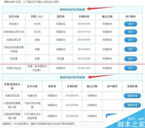 4、系統就會顯示出套餐內外包月的在用業務具體信息,如果不想要可以直接點擊退訂。