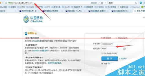 2、通過網站查詢,進入移動官網,選擇手機號碼歸屬地區,輸入手機號碼和服務密碼登陸,如果忘記密碼也可以通過短信驗證碼登陸。