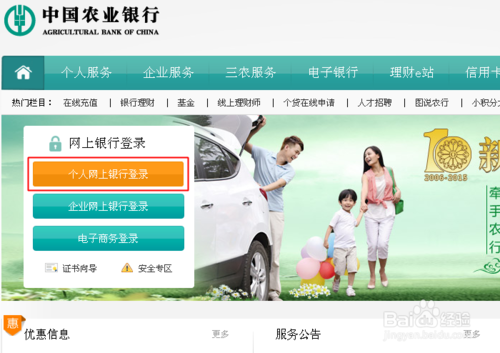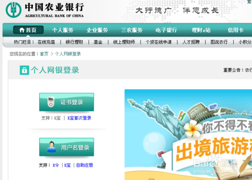 2、首先將您的K寶、或K令插入電腦。然後打開農行網銀首頁點擊【 個人網上銀行登錄 】