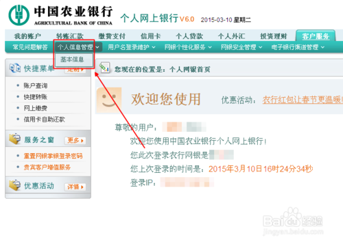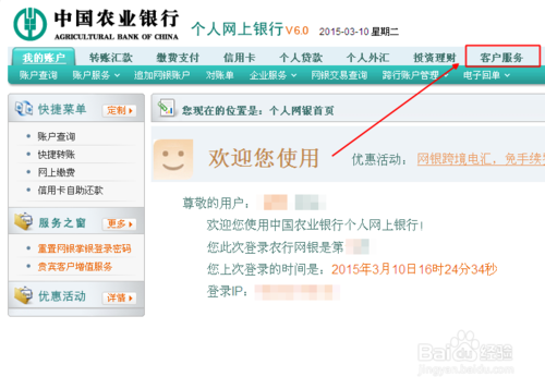4、成功登錄農行網銀後,先在導航欄點擊【 客戶服務 】