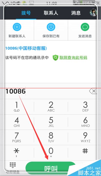 2、然後在撥號中輸入10086,之所以輸入這個,是為了避免打擾自己的朋友,用10086來驗證(對方是機器,沒什麼打擾)。然後點擊“呼叫”。