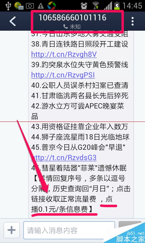 3、再下去好幾條信息之後(同一天,垃圾短信就來了好多條),終於遮遮掩掩露出收費面紗:在最後面有了這樣一句話“點播0.1元/條信息費”,看官!這裡為什麼是0.1是大有門道的!很多人以為這0.1是短信費,其實這是短信費之外的信息費。也就是你發一條信息要收0.2元。