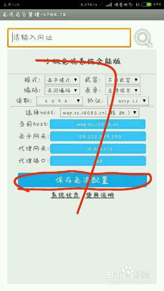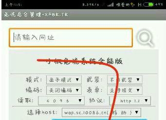 等待一番之後呢,在點啟動全局, 手機必須root, 啟動成功後有個免流管理,點進去, 會出現設置界面, 好的,恭喜你成功一半了。 記得模式改為聖子模式,host改為10086移動那個,點保存, 在軟件首頁有個開啟放跳。 可以點那個“免流後台管理-XFBK.TK”進行如圖的設置,必須設置成移動的