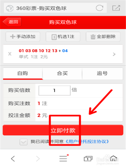 6、頁面跳到此界面,看看是不是自己所選的號碼,如正確,請點立即付款,這樣彩票購買成功》