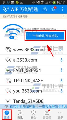 1)裝你的手機安裝並打開【WIFI萬能鑰匙】,點擊【一鍵查詢萬能鑰匙】。(如下圖)