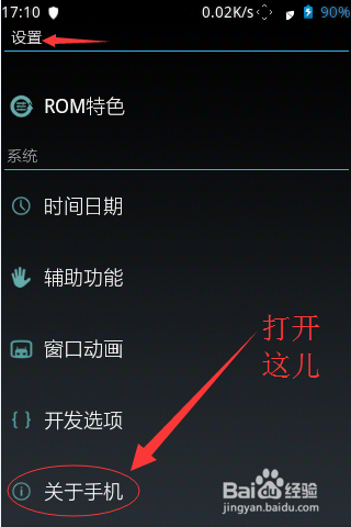 2、接著點開關於手機