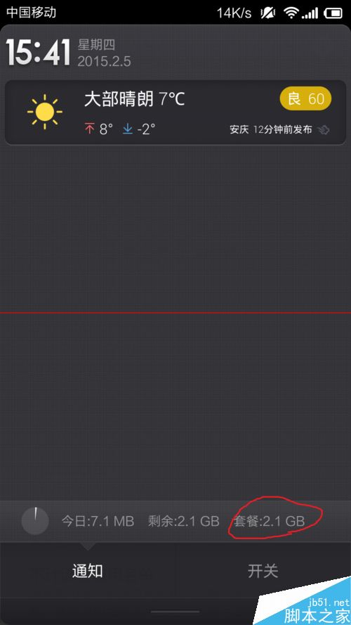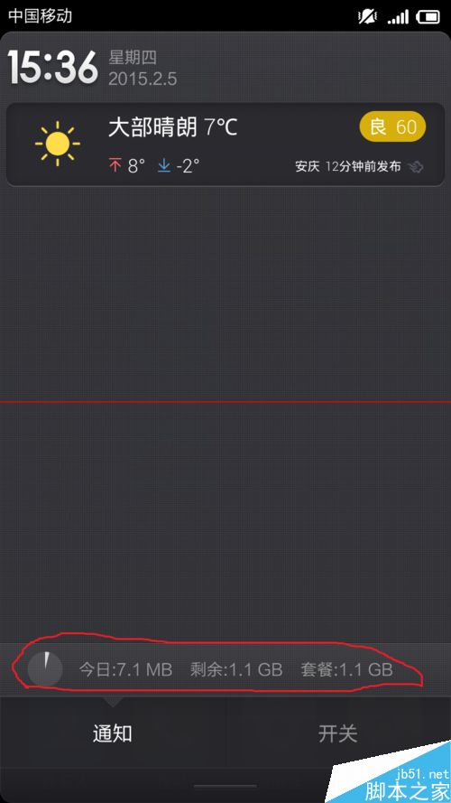 1、小米手機系統自帶網絡助手的,可以進行日常的手機維護,流量的設置的等。首先,從手機頂端下滑可見目前流量,如圖所示