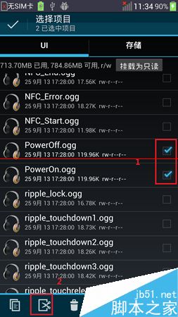 4、找到PowerOff.ogg和PowerOn.ogg對應關機和開機鈴聲,如下圖1示,選中兩個,如下圖2所示,再點擊下面剪切按鍵,如2示。