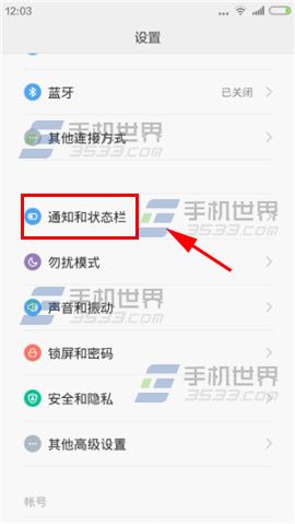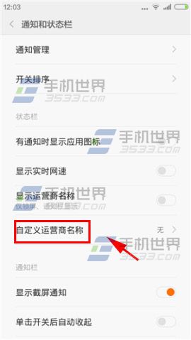 1)打開小米Note手機【設置】點擊【通知和狀態欄】,選擇【自定義運營商名稱】。(如下圖)