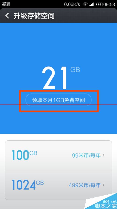 5、在“升級存儲空間”界面,點擊“領取本月1GB免費空間”。