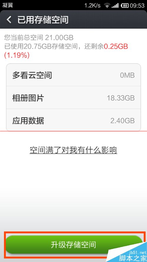 4、在“已用存儲空間”頁面,點擊“升級存儲空間”。