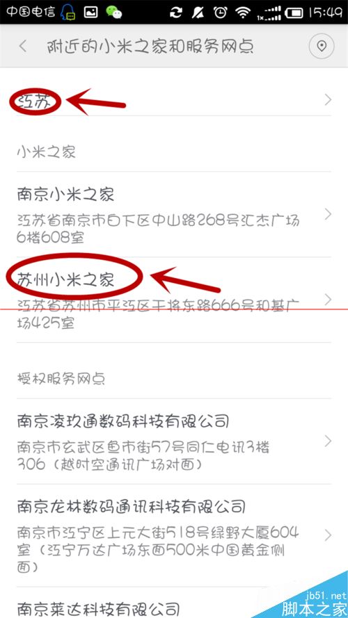 3、打開後,手機會自動定位你所在的位置。如果無法准確定位請打開GPS功能。再不行,請手動選擇你所在的位置。暫以“蘇州小米之家為例”