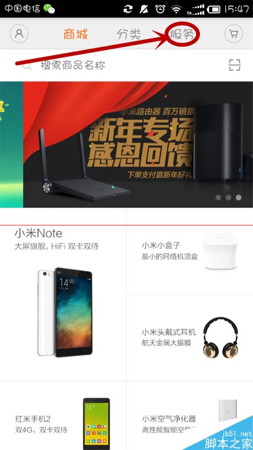 1、首先,打開手機自帶的“小米商城”,在首頁選項卡中選擇“服務”項!
