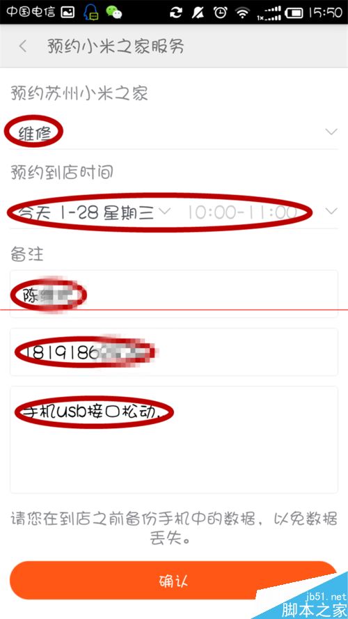 6、比如,你手機壞了,需要維修,那你就點擊下拉選項卡選擇“維修”。服務時間 自己可以根據自己的情況選擇。然後,姓名,手機號,手機問題描述填寫好。