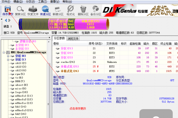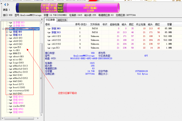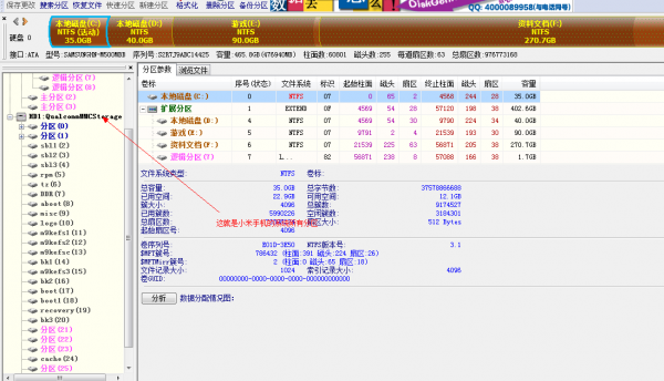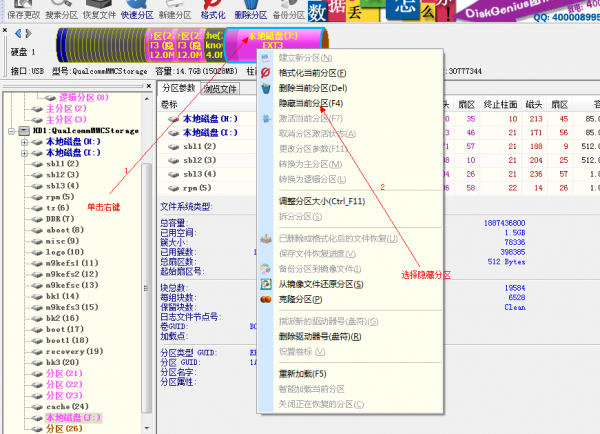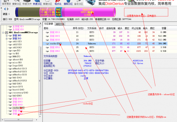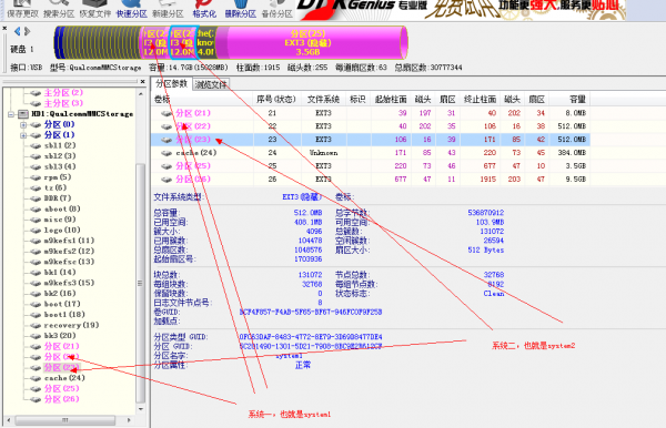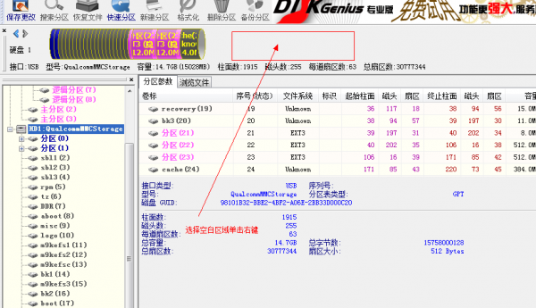 步驟4:斷開USB,關機,然後手機再重新連接電腦。對手機重新進行線刷,刷完,不要拔掉數據線,直接打開DiskGenius,電腦可以自動識別手機分區,即可。