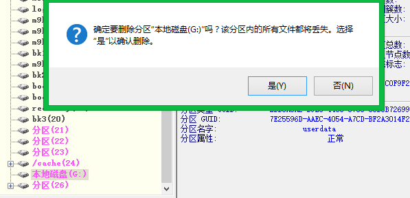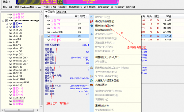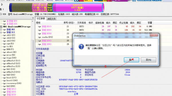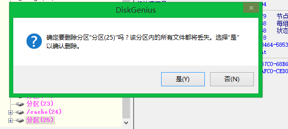 步驟5:打開DiskGenius,修改分區25和分區26。刪除分區25和分區26。注意,刪除分區25後,26分區會變成分區25。此時,繼續刪除分區25.