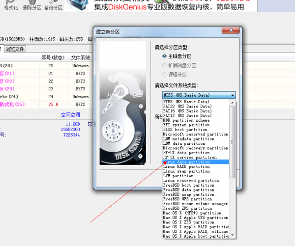 圖片中文件系統類型選擇linux data partition,注意。下兩張圖顯示的是NTFS,請改正為linux data partition