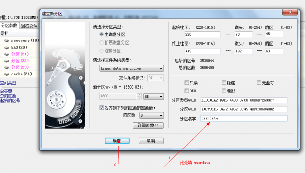 步驟6:重新調整分區大小,利用DiskGenius進行分區,選擇空白的磁盤,建立新分區,格式為linux data partition。勾選對齊到下列扇區的整數倍。扇區數選擇8。點擊詳細參數,分區名字為userdata。點擊確定。
