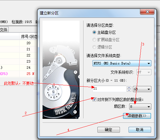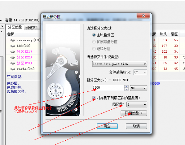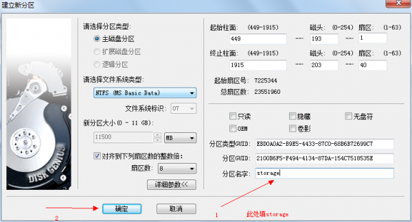 步驟:選擇空白的磁盤,建立新分區,格式為linux data partition。勾選對齊到下列扇區的整數倍。扇區數選擇8。點擊詳細參數,分區名字為storage。點擊確定。