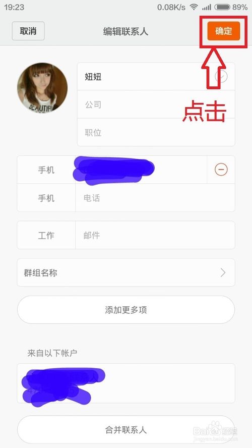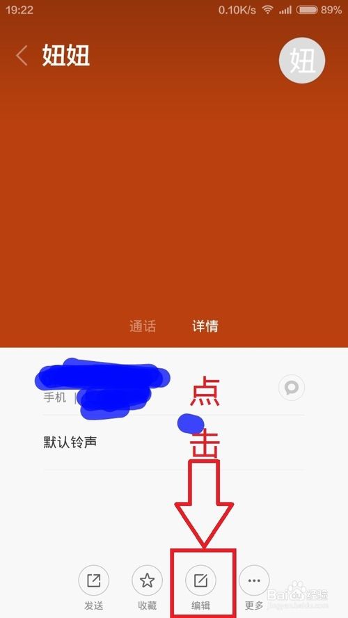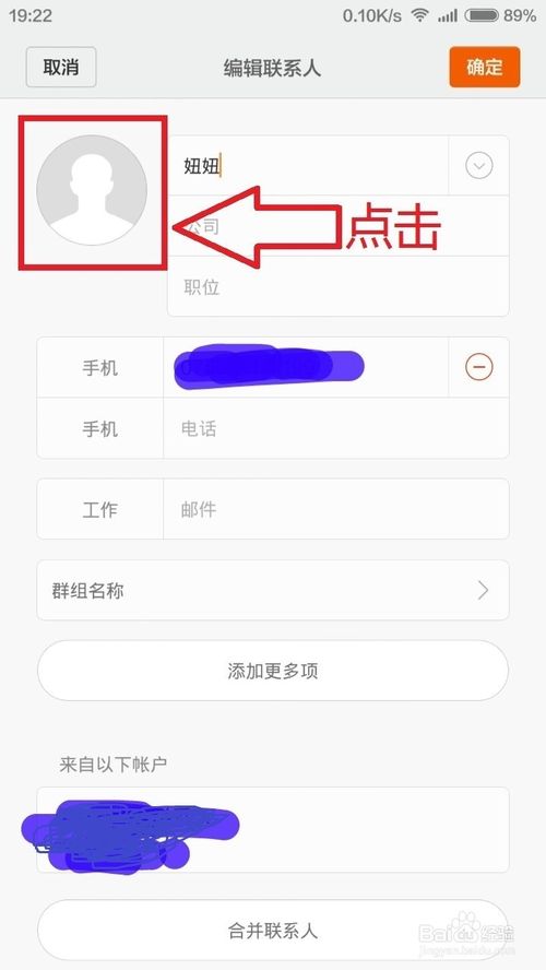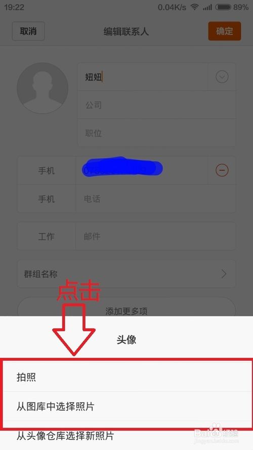 2、選擇好聯系人後,點擊編輯,然後進入到了編輯界面,點擊頭像(配圖有說明),選擇添加圖片,有兩種方式可選一是拍照,一是從本地圖庫選擇。兩種方法都行,你可以先拍好照,也可以即時拍照。
