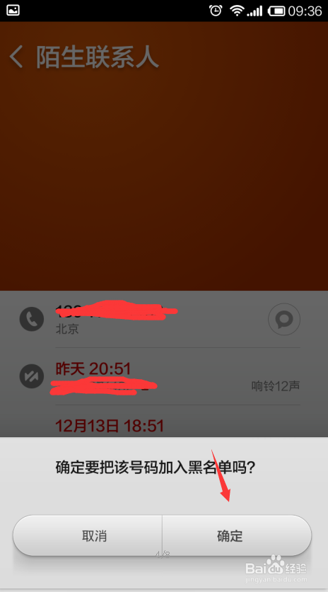 3、根據提示,點擊確定,把該號碼加入黑名單。這時顯示是對勾。