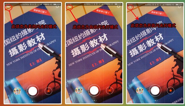 這裡說一下相機的閃光燈開關,有些伙伴可能沒有發現在哪裡,打開相機後我們看到左上角有個“閃電”的符號,這個就是閃光燈的開關。這個開關可以分三次點擊,每次都有不同的效果。當旁邊有個A的時候,此時閃光燈為自動模式。