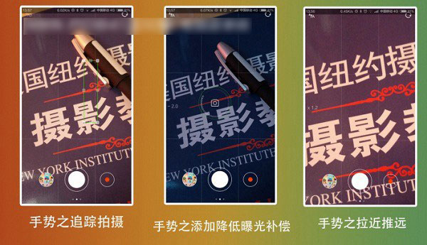 MIUI 6相機裡的隱藏功能,我在這裡提及一下,手勢追蹤——我們只需要用倆個手指分開點按一下屏幕,屏幕會出現一個綠色的追蹤對焦框,即使被攝體是運動的,你也可以拍攝出清晰的畫面。在手機中央部位我們用一個手指畫圓,會發現發出滴滴的聲音,隨之畫面或許變暗或許變亮,這就是增加和降低曝光補償的操作。用倆個手指放在屏幕上慢慢分開我們會發現被攝體變近或者變大了,這就是手勢的拉近推遠功能。我們在屏幕上輕輕的下滑操作你會神器的發現可以切換前後攝像頭。是不是很贊?