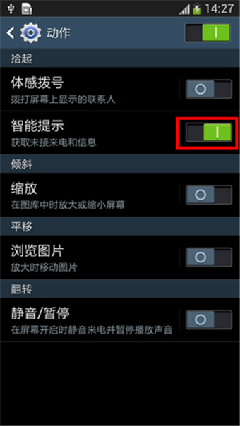 其實智能提醒就是指當拿起手機時會通過振動提醒我們,以此來查看漏掉的來電以及短信,三星手機Galaxy S4就支持智能提醒這個功能。
