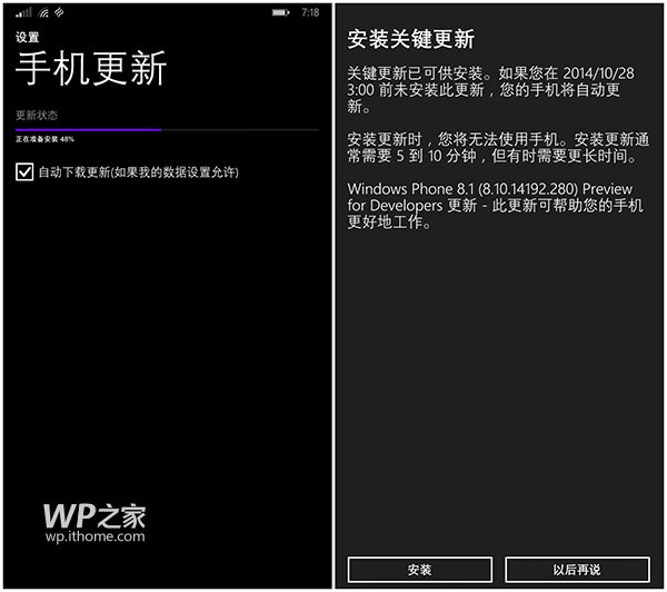 @WP之家 報道,今天微軟開啟新一輪的WP8.1 GDR1預覽版更新推送,系統版本號為8.10.14192.280,更新包大小是26MB左右。本次更新在檢查到更新下載後,在10月28日凌晨3:00前如未安裝,此後會自動安裝。下面小編為大家帶來wp8.1 gdr1 預覽版第三次更新安裝詳情簡述,一起來看看吧!
