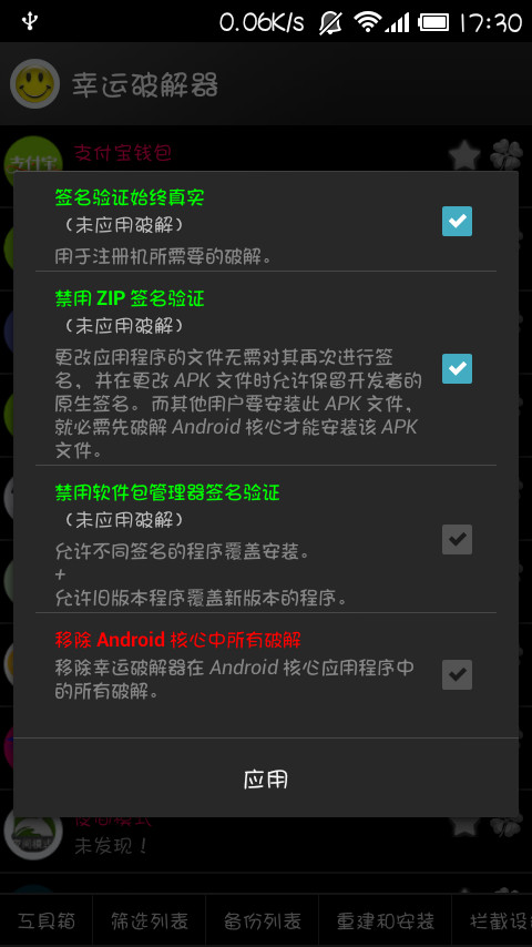 重啟下手機,再打開幸運破解器的核心破解,勾“移除 Android 核心中所有破解”,按“應用”重啟。
