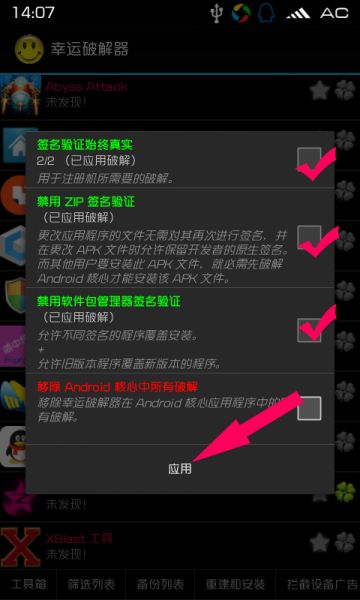 稍等一會,出來四個選項,我們勾上頭兩個綠的(簽名驗證始終真實、禁用 ZIP 簽名驗證),按“應用”。然後大概有個提示,點“確定”,會重啟手機。重啟後可能自動優化什麼的,耐心等待;