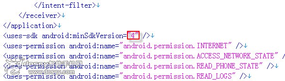 那麼,這是怎麼做到的呢?很簡單,只要給apk文件做個小手術,改動一個數字就能實現。對,就是改動一個數字。具體而言,我們要做的只是用apktool解包apk文件,用文本編輯器打開AndroidManifest.xml這個文件,找到minSdkVersion這一行,將等號後面的數字由3改為4,就這麼簡單。以下是“歷史每天回顧”裡的AndroidManifest.xml文件代碼: